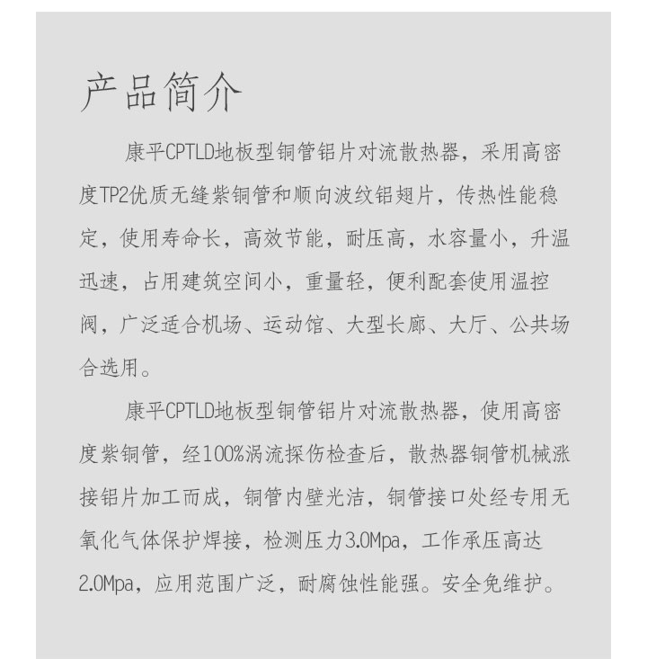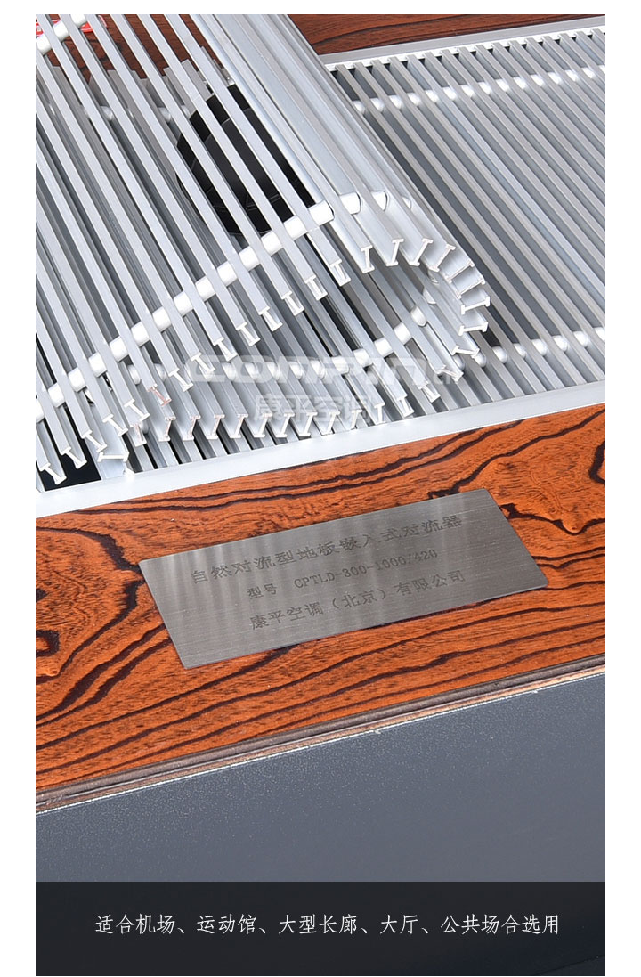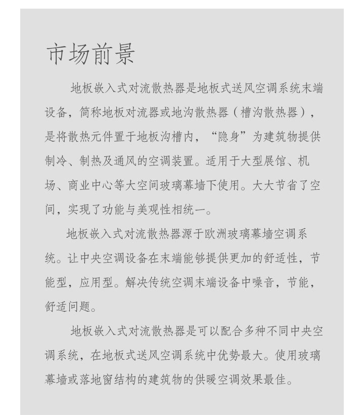 地板嵌入式對流散熱器是地板式送風空調(diào)系統(tǒng)末端設備,簡稱地板對流器或地溝散熱器(槽溝散熱器),